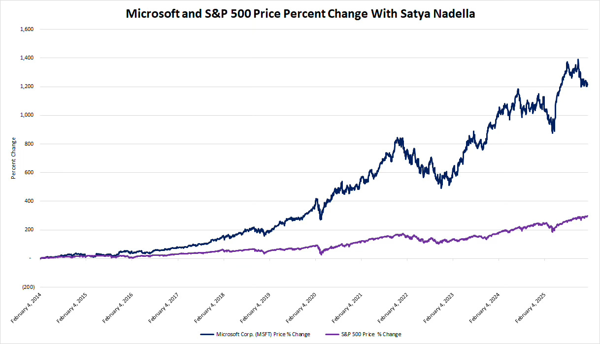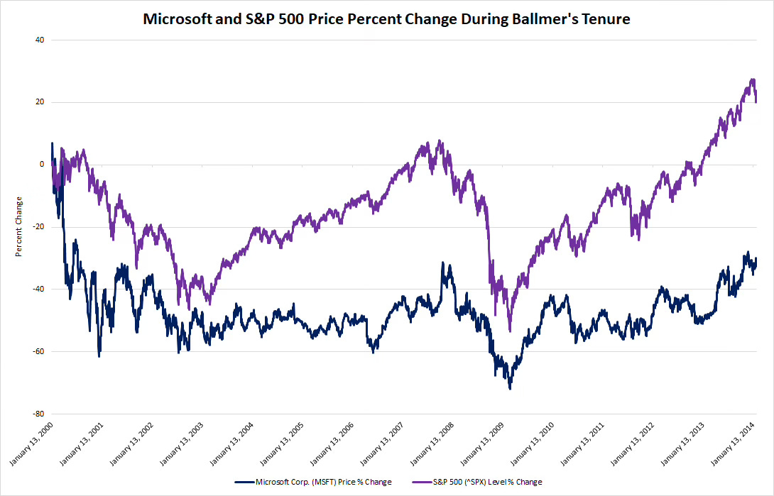 Under Ballmer’s tenure, he was fired February 4, 2014, Microsoft returned -32.57% on a price basis while the S&P 500 returned 21% over that same time.