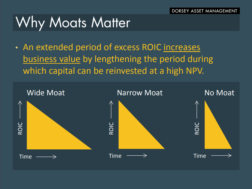 Dorsey Capital Management’s latest presentation on competitive advantages and capital allocation. The reason why high-quality wide-moat companies are usually more expensive than the broad market is the increased period at which capital can be reinvested at high rates of return. The terminal value is a big component of a discounted cash flow model. High-quality wide moat companies have a higher terminal value.