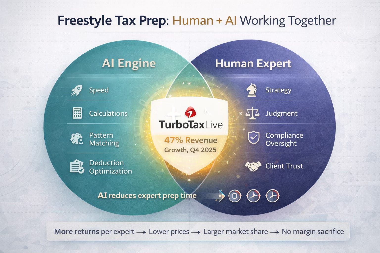 It’s hard to scale one-on-one professional help, which is why TurboTax has made only small inroads into the assisted tax prep market. But AI tools can reduce the time experts spend preparing a return by about 20%. Every hour saved per return means more returns per expert, which means Intuit can serve more of the assisted market without proportionally growing headcount.