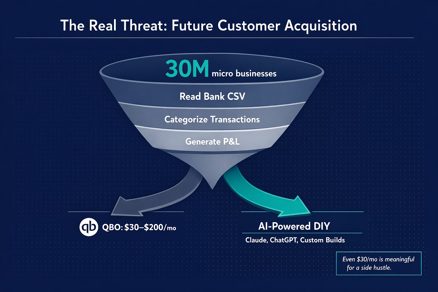 The concern is not that QBO gets replaced overnight. Switching costs are too high for a small business already running on QBO to risk an unproven, vibe-coded DIY system just to save $30–$200 a month.