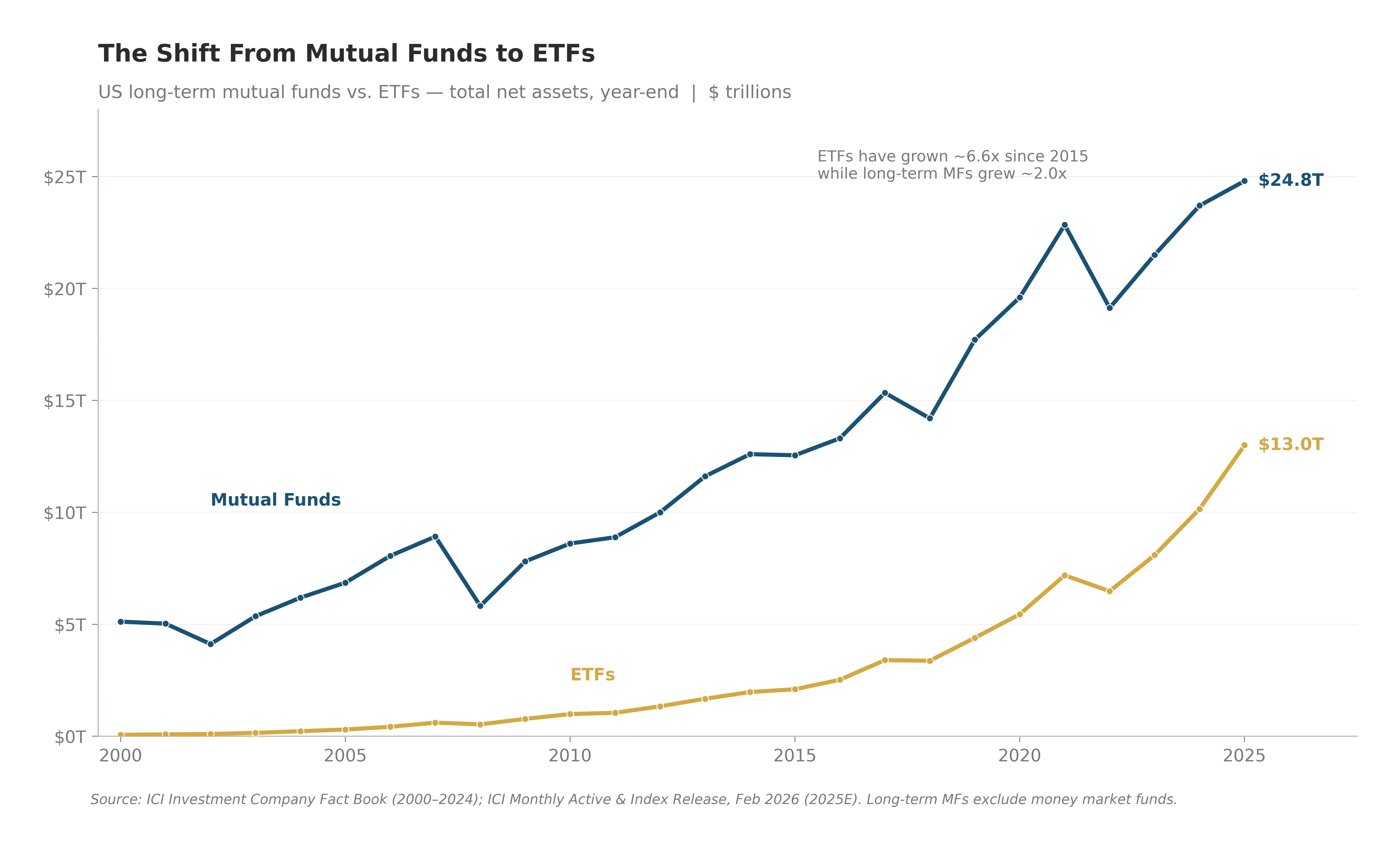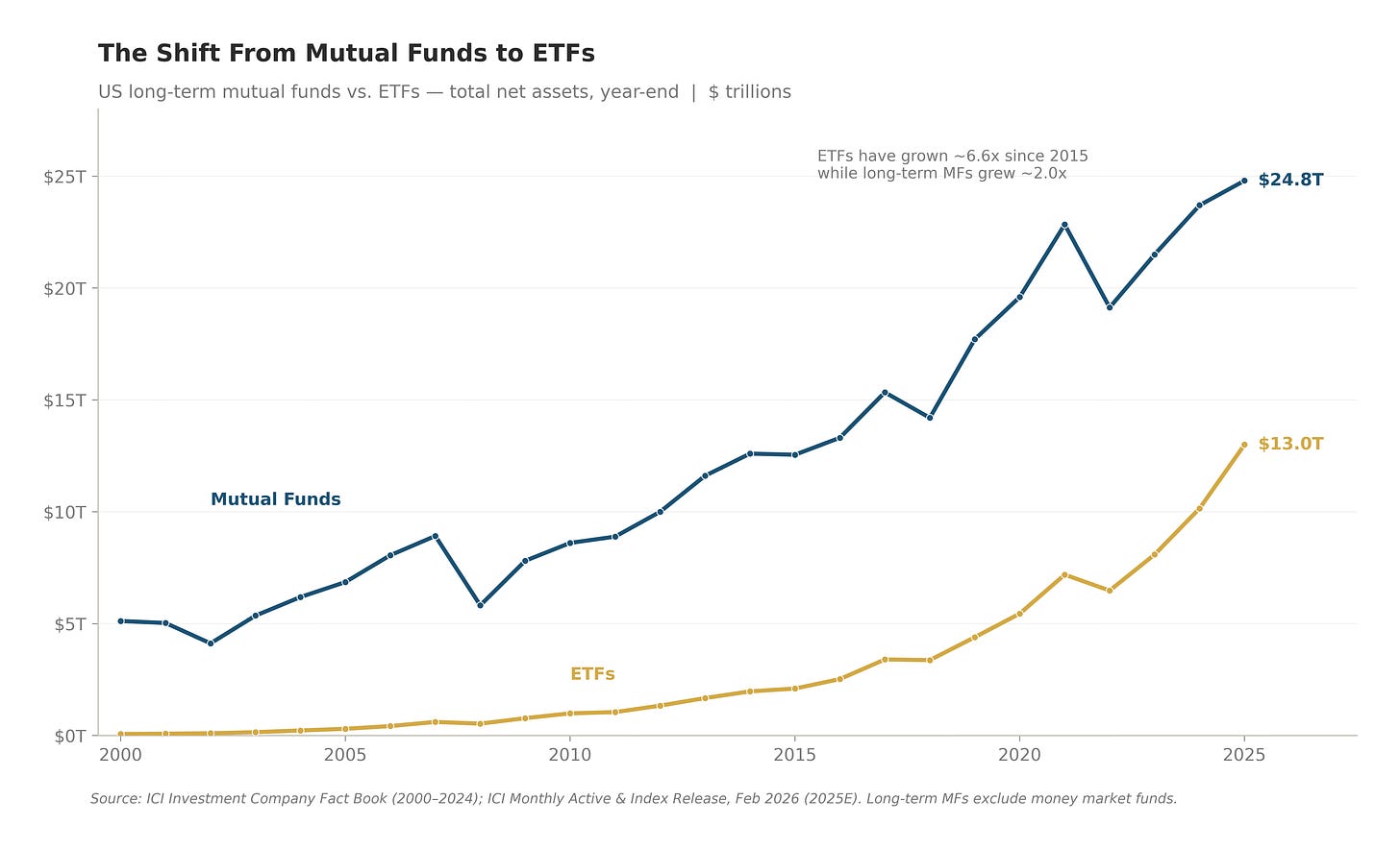 Active mutual funds are a shrinking pool, losing $250–500B a year. The main things propping them up are market appreciation and 401(k) plans.