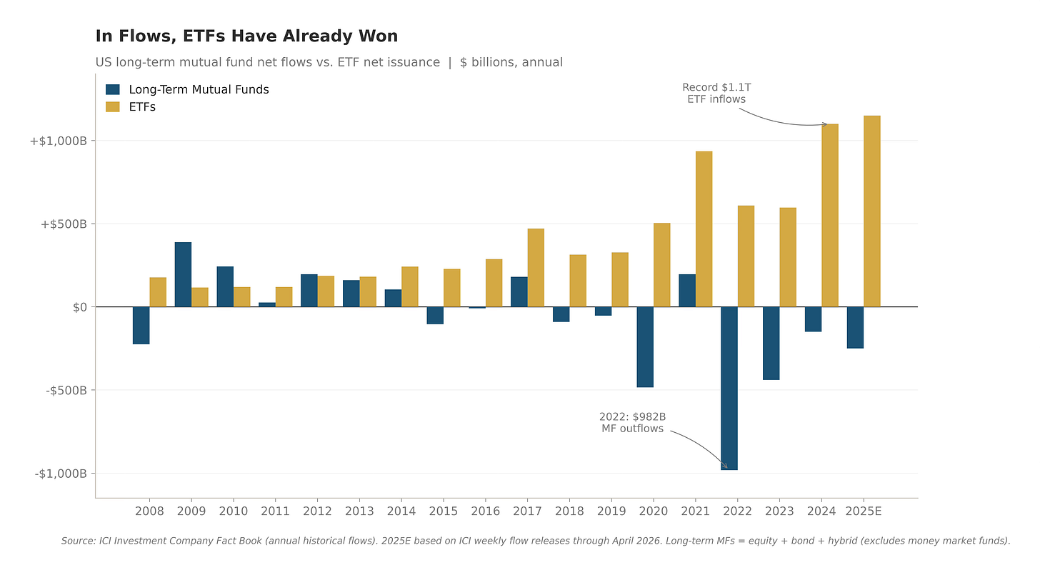 Since 2015, long-term mutual funds have had net outflows in most years. Since 2020, those outflows have run in the hundreds of billions annually.