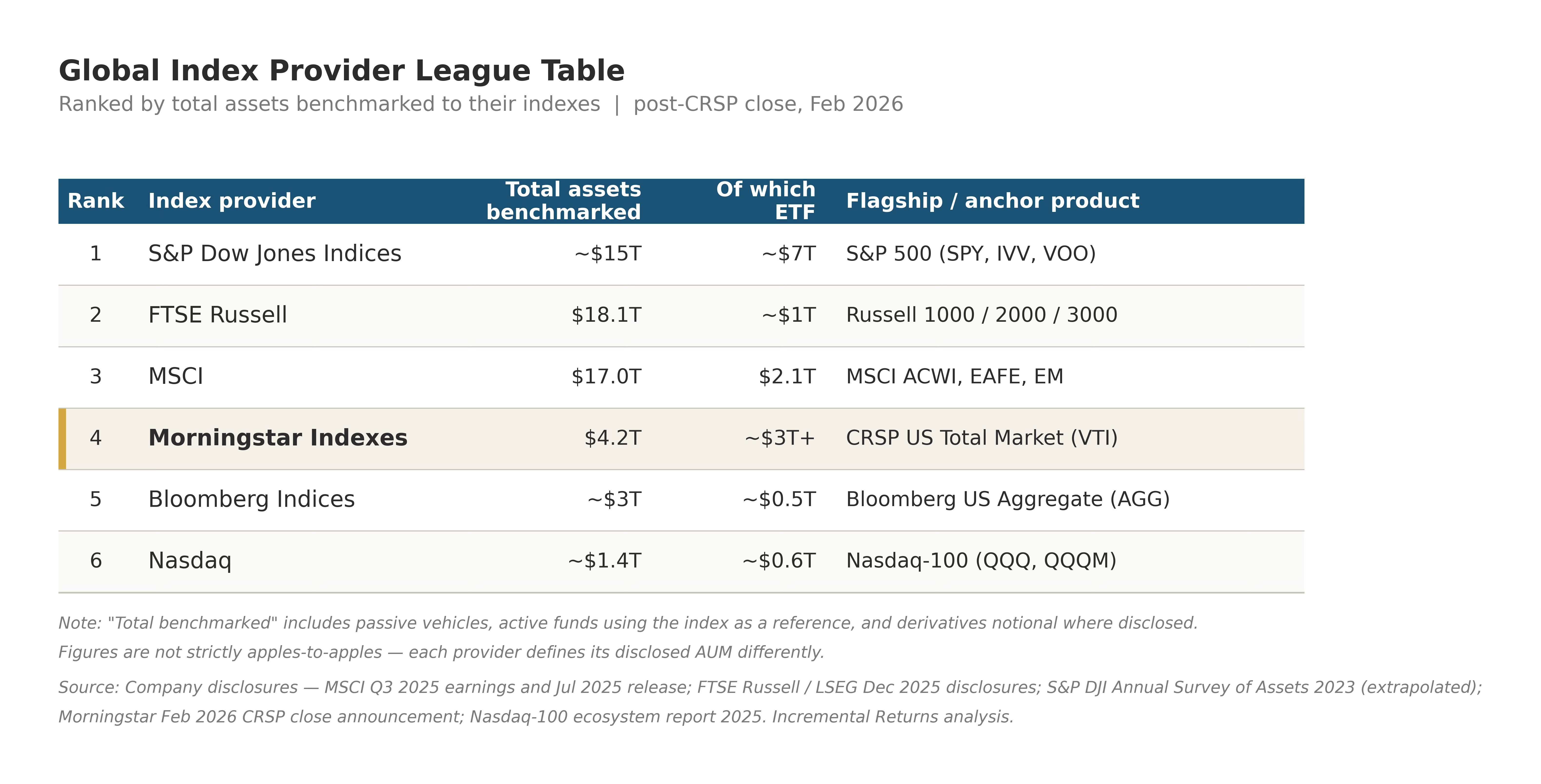Morningstar Indexes went from a subscale also-ran to #4 globally, with $4.2T of assets benchmarked.