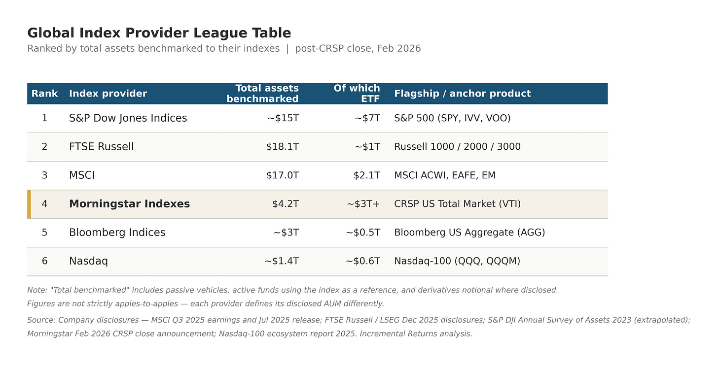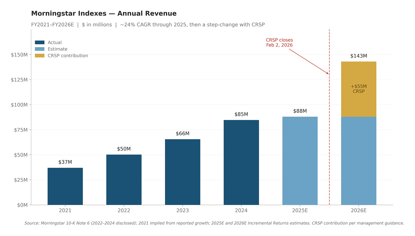 Morningstar Indexes revenue compounded from $37M in 2021 to ~$88M in 2025 before the CRSP acquisition. Then, in February 2026, Morningstar closed the $365M acquisition of CRSP, the University of Chicago-affiliated index provider whose US Total Market Index is the benchmark the Vanguard Total Stock Market Index Fund (~$2T AUM) is contractually required to track.
