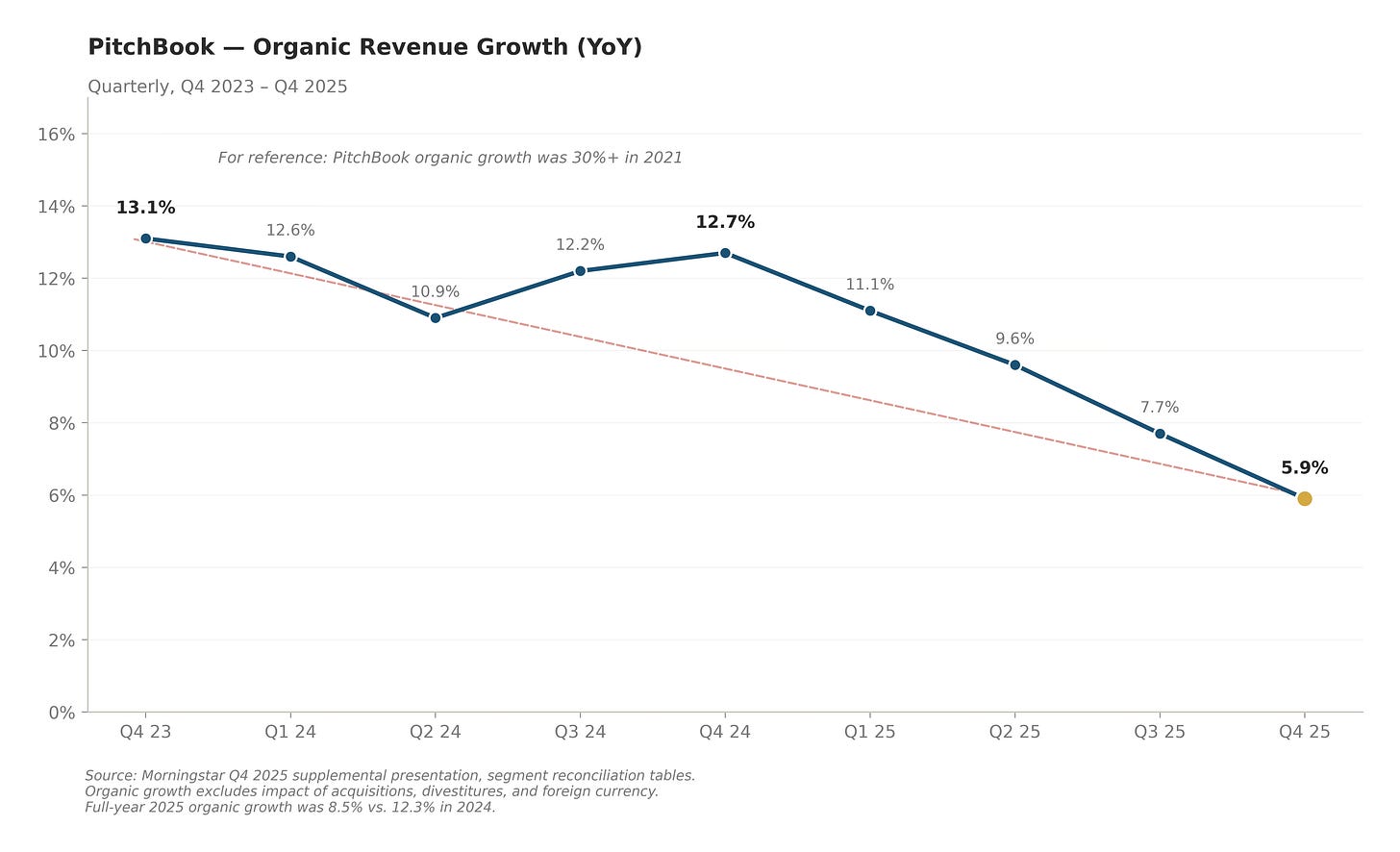 PitchBook’s organic growth decelerated from 30%+ in 2021 to 8.5% in 2025, and Q4 2025 came in at just 5.9% organic, the lowest quarter in the dataset.