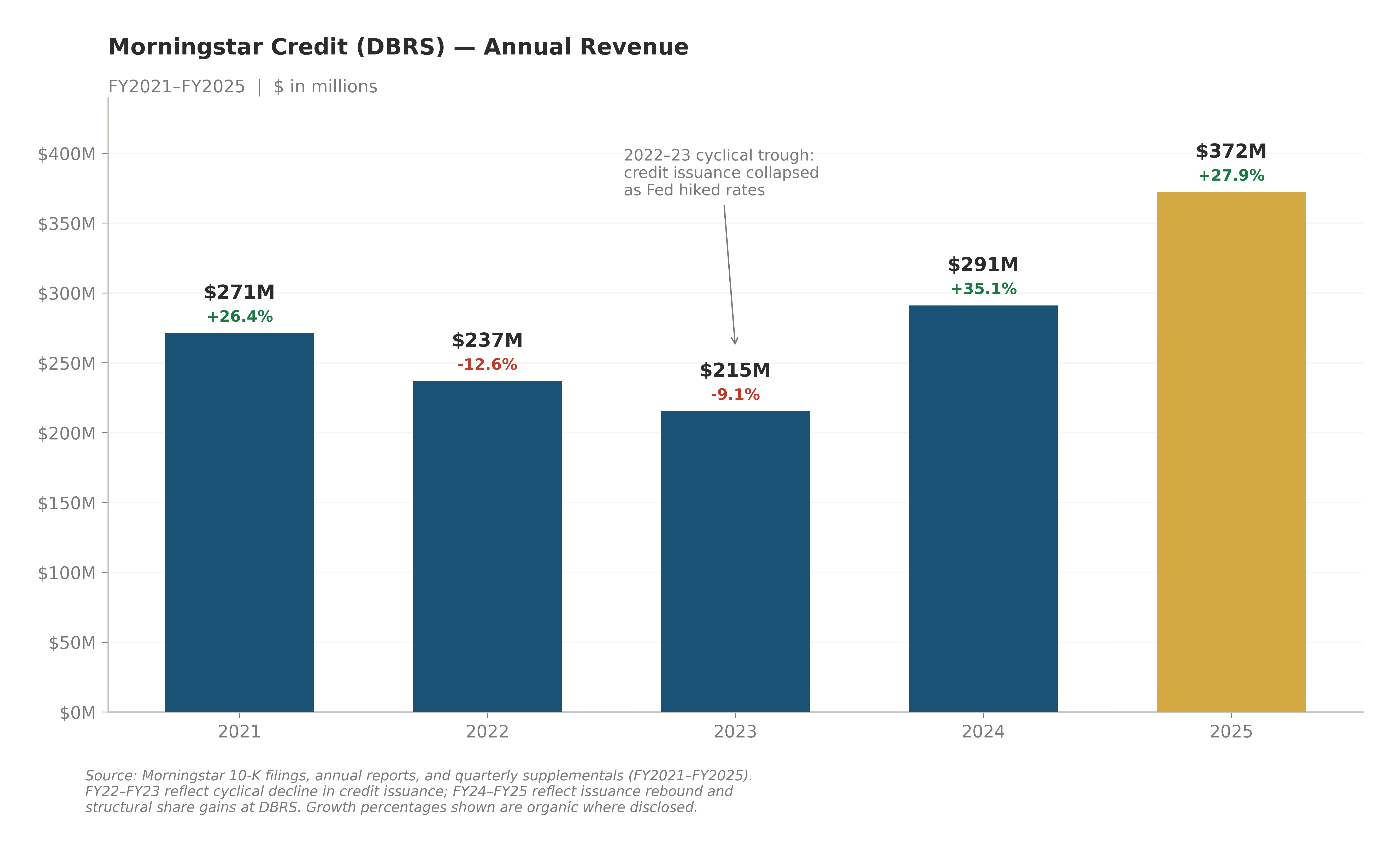 Credit revenue peaked at $271M in 2021, then fell for two straight years as the Fed hiked rates and CMBS / RMBS issuance collapsed.