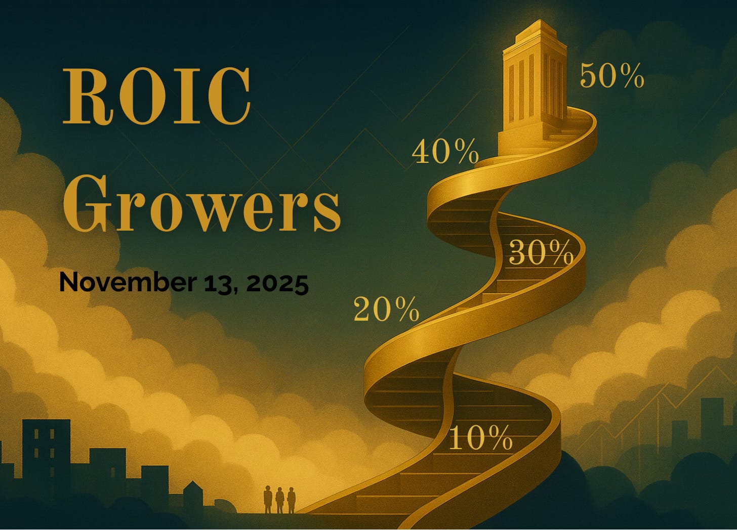 The spreadsheet below is a simple screen that selects for companies that have grown their ROIC over the last 3 years with a market cap over $1 billion. I’ve sorted it by highest to lowest ROIC.